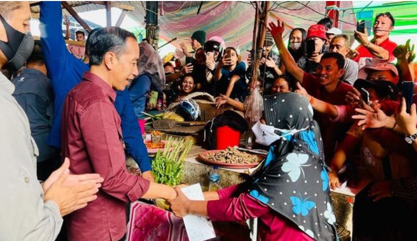 "Jokowi, Jokowi, Jokowi,” teriak masyarakat ketika Presiden berjalan di pasar membagikan bantuan sosial berupa bahan pokok
